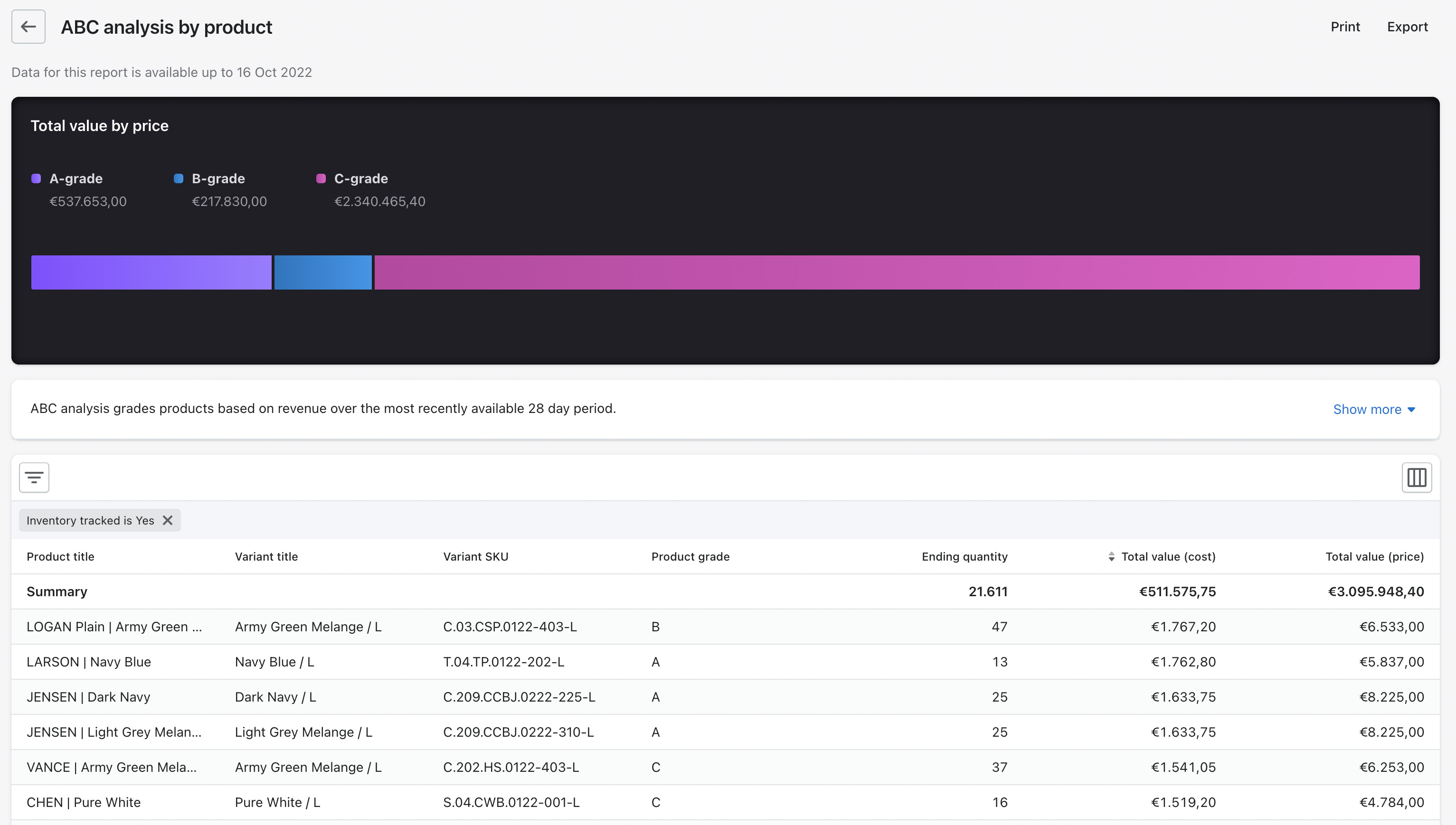 Eine gute Möglichkeit, Ihre besten Produkte zu identifizieren, ist ein Blick auf Ihre ABC-Analyse. Wenn Sie Shopify nutzen, finden Sie Ihre ABC-Analyse im Bereich "Berichte".